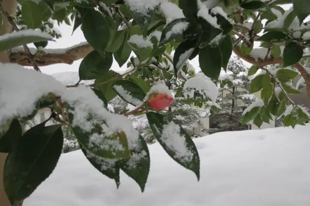 また、花の少ない季節ですが、 雪に負けずに、ツバキもがんばっています。 他にも、センリョウの赤い実がなっていたり、 雪の白と赤い花や実のコントラストもなかなか綺麗です。