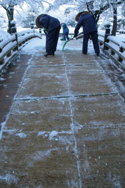 雪吊りに積もった雪は気温が上がると落ちてしまうので、 写真のような景色は朝の短い時間か、降雪直後の晴れ間でしか見ることがません。 防寒対策を万全に、少し早起きをして兼六園の散策はいかがですか。