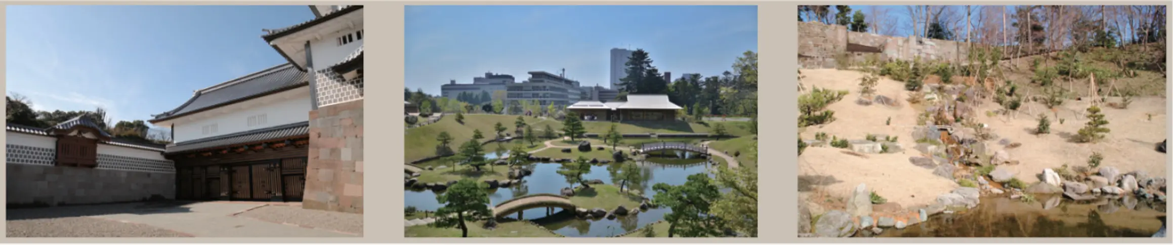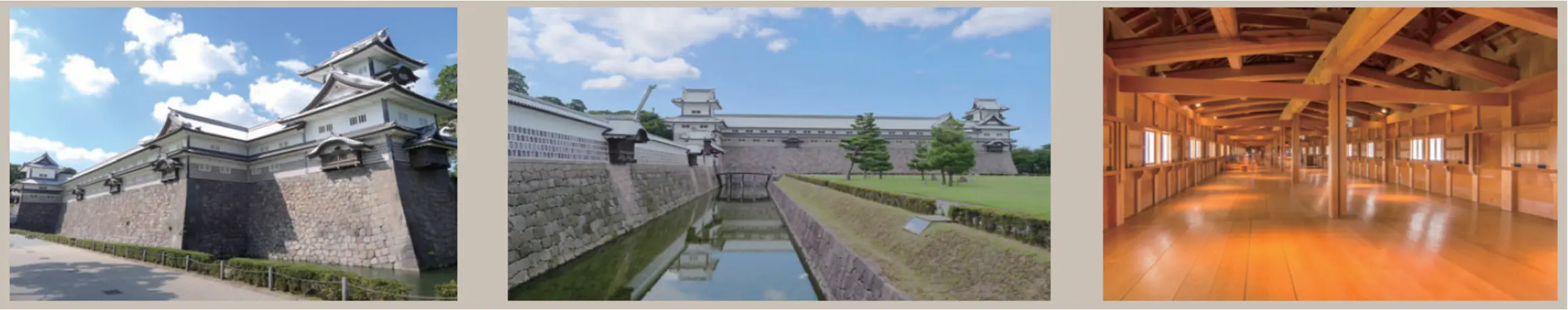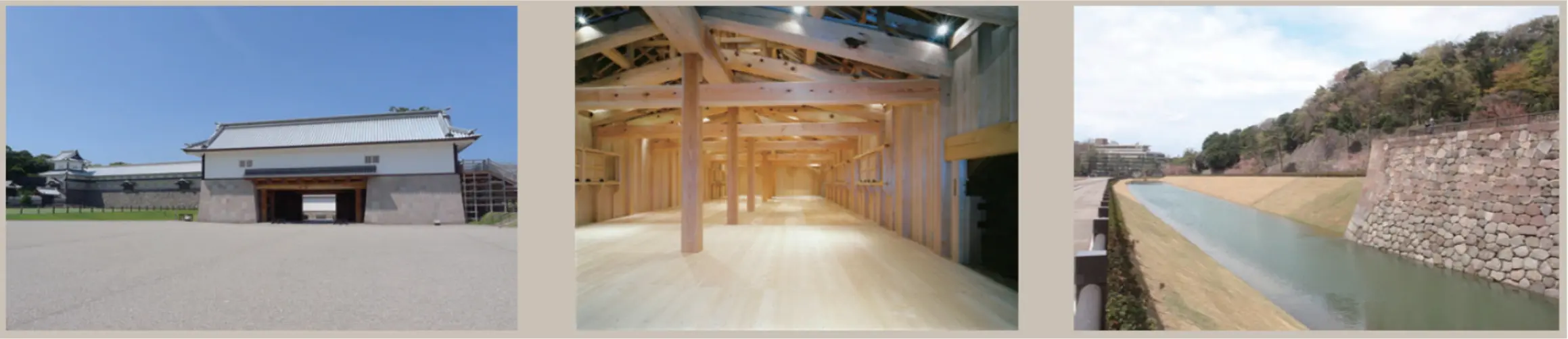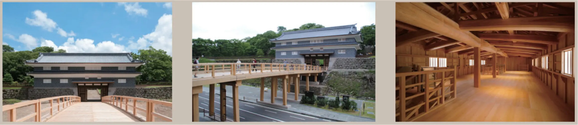石川県では、平成13 年の菱櫓・五十間長屋・橋爪門続櫓をはじめとし、継続的に金沢城の復元整備を進めています。整備にあたっては石川門や三十間長屋など現存する建造物と整合する江戸後期の姿を復元の時代設定とし、文化財調査等に基づく史実を尊重した復元に取り組んでいます。
